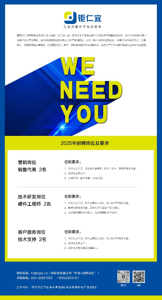 南京鉅仁宜智能科技有限公司是一家專注于工業(yè)級元器件研發(fā)與生產(chǎn)的高科技企業(yè),致力于推動核心電子元器件的國產(chǎn)化替代,助力中國智能制造與自主可控產(chǎn)業(yè)鏈建設。公司匯聚國內(nèi)頂尖技術團隊,深耕RS485通信芯片、壓敏電阻、薄膜電容等關鍵領域,打造覆蓋芯片、器件、整機的全鏈條自主創(chuàng)新體系,成為國產(chǎn)工業(yè)元器件領域的重要供應商。核心產(chǎn)品與技術優(yōu)勢 公司堅持自主研發(fā)、自主可控,產(chǎn)品線涵蓋: 電路保護器件:高性能壓敏電阻、電涌保護器(SPD) 被動元件:高穩(wěn)定性陶瓷電容、薄膜電容 通信與智能控制:工業(yè)級RS485芯片、藍牙模組 電力電子核心模塊:智能電能表負荷開關、B型漏電保護斷路器、直流剩余電流檢測模塊、智能微型斷路器 憑借高可靠性、定制化設計、成本優(yōu)化三大核心優(yōu)勢,產(chǎn)品廣泛應用于: 智能三表(電表、水表、氣表) 新能源(光伏、儲能、充電樁) 電力電子(工業(yè)電源、變頻器) 軍工及...